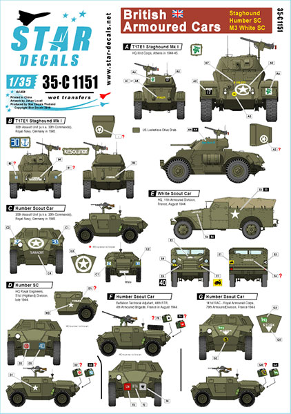 Star Decals Model Kit Decals 35-C1151 British Armoured Cars. Staghound  Humber SC  M3 White SC.