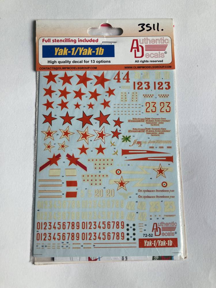 DISCOUNT DECALS 1/72 3511. AUTHENTIC DECALS 72-52 YAK-1/YAK-1B