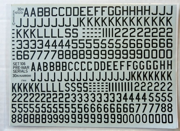 MODELDECAL Discount Decals 670. 106 BRITISH PRE WAR 30 INCH BLACK SERIAL NUMBERS AND LETTERS