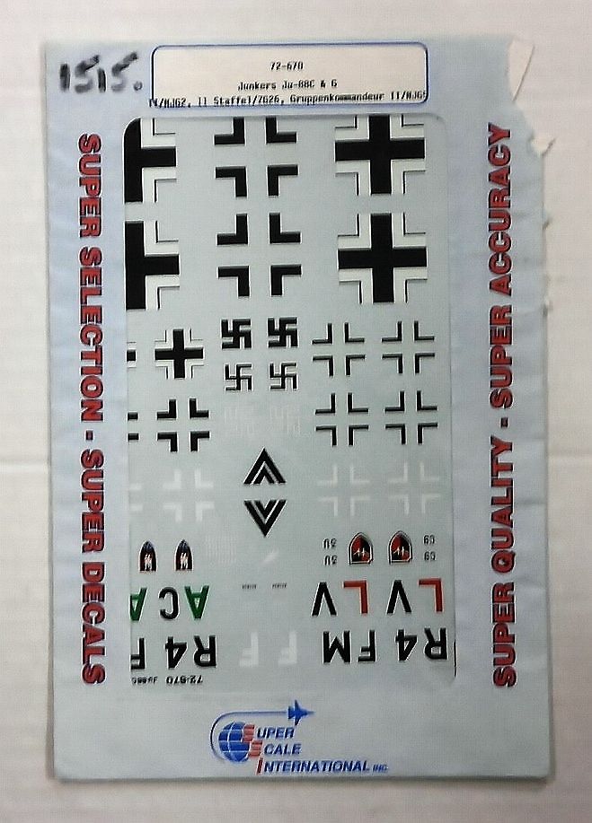 SUPER SCALE INTERNATIONAL  1515. 72-670 JUNKERS Ju-88C   G II/NJG2 11 STAFFEL ZG26 GRUPPENKOMMANDEUR II/NJG5 Discount Decals